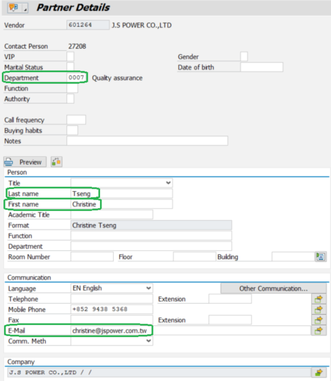 b. Maximum 2 contacts can be added under Department "0007" (*). All will be put in the "To" of the initial Email sent to the supplier