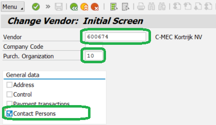 Select the vendor, enter "10" in Purch. Organization ("40" for Televic Rail GmbH) and enable "Contact Persons":