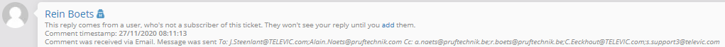 - In the case of screenshot above, the ticket was sent to r.boets@pruftechnik.be, however this person replied via rein.boets@pruftechnik.com.
