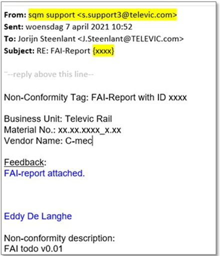 - Do NOT reply on the Email with the FAI-result (content as below), because when these fields are in your reply,